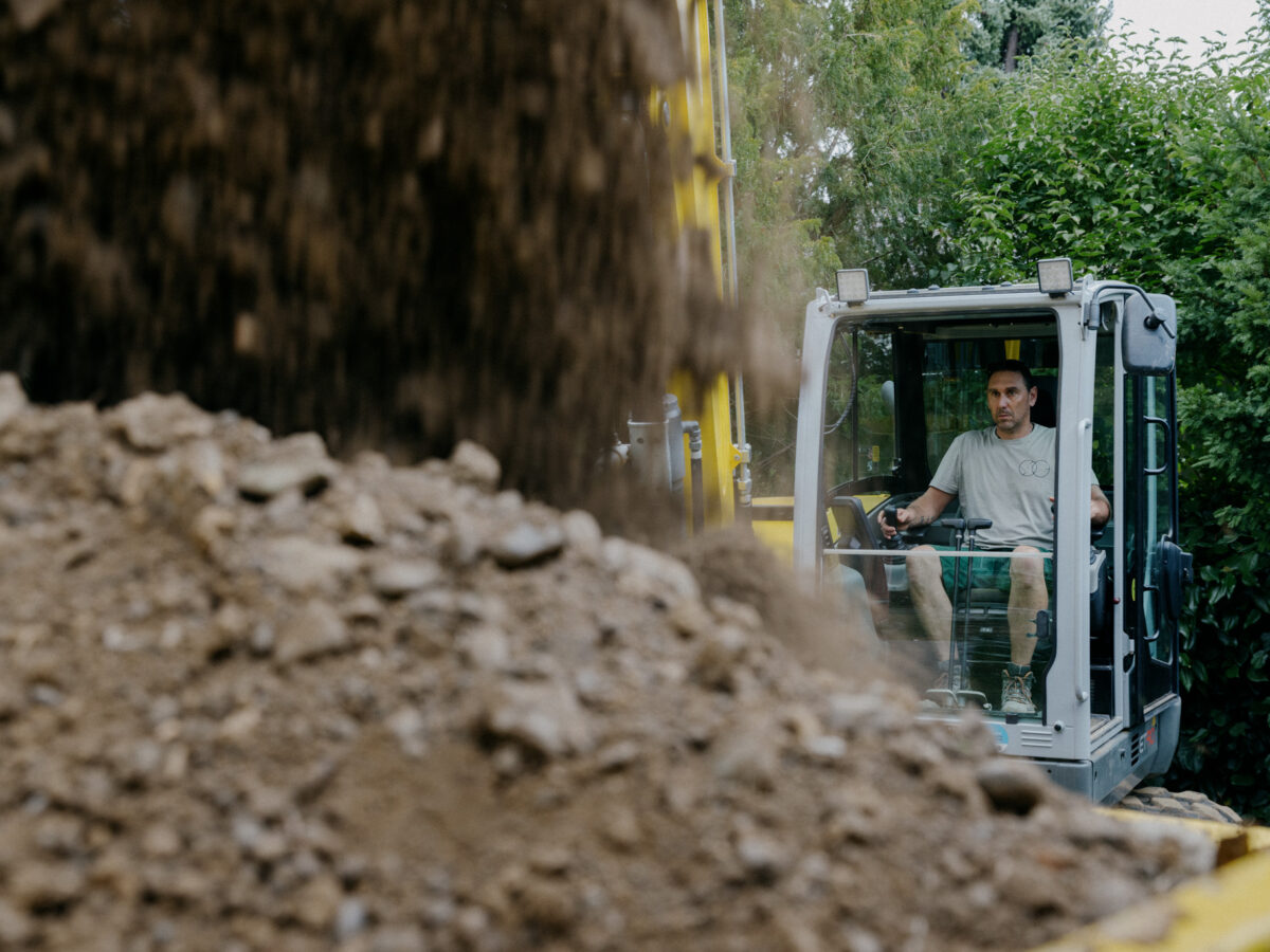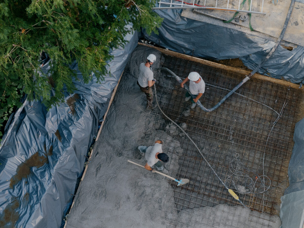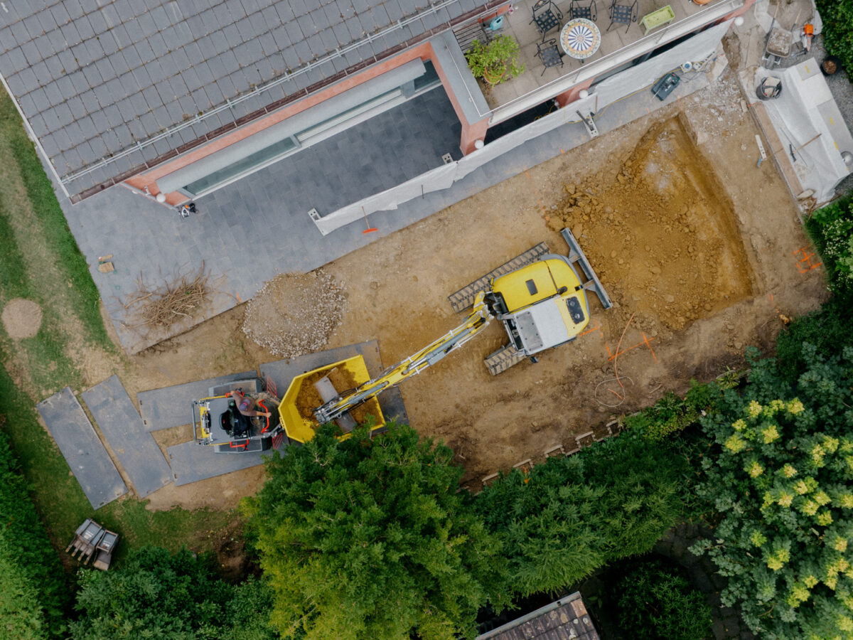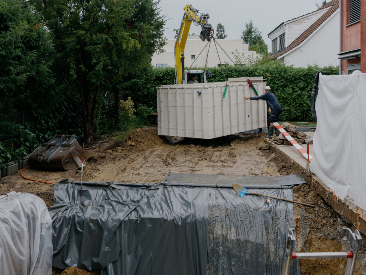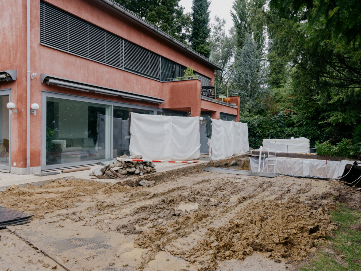 Planung, Baueingabe, Baustelleninstallation, Aushub Technikschacht und Leitungsgraben, Betonfundament, Technikschacht einbauen, Aushub Schwimmbad, Bodenplatte betonieren, Lieferung und Montag des Schwimmbads, sanitäre und elektrische Installationen, Hinterfüllarbeiten mit Sickerbeton, Natursteinplattenbelag verlegen, Inbetriebnahme Schwimmbad, Pflanzen setzen, planieren und Rollrasen verlegen.