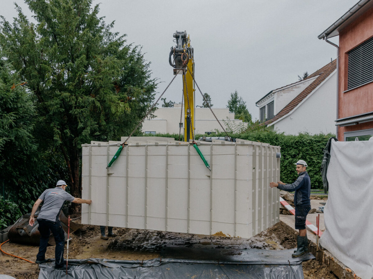 Grosser unterirdischer Technikschacht, Arbeiten auf engen Platzverhältnissen, Schwimmbad wurde vor Ort zusammengeschweisst